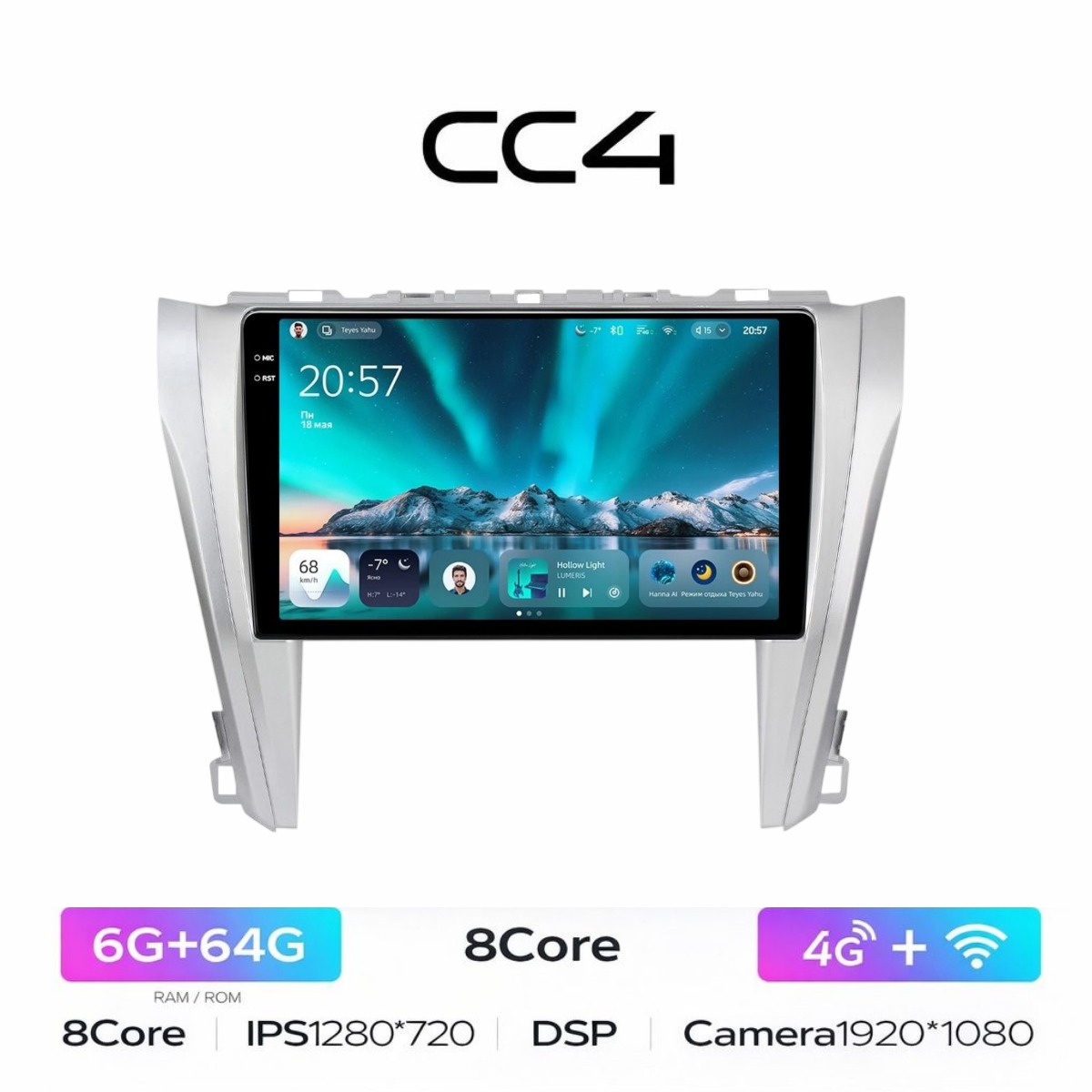 Есть функция разделения экрана на две части и слот под сим-карту 4G, что очень удобно в дороге! Смена тем экрана, а также поддержка Wi-FI, Bluetooth, Carplay, подключение задней камеры.