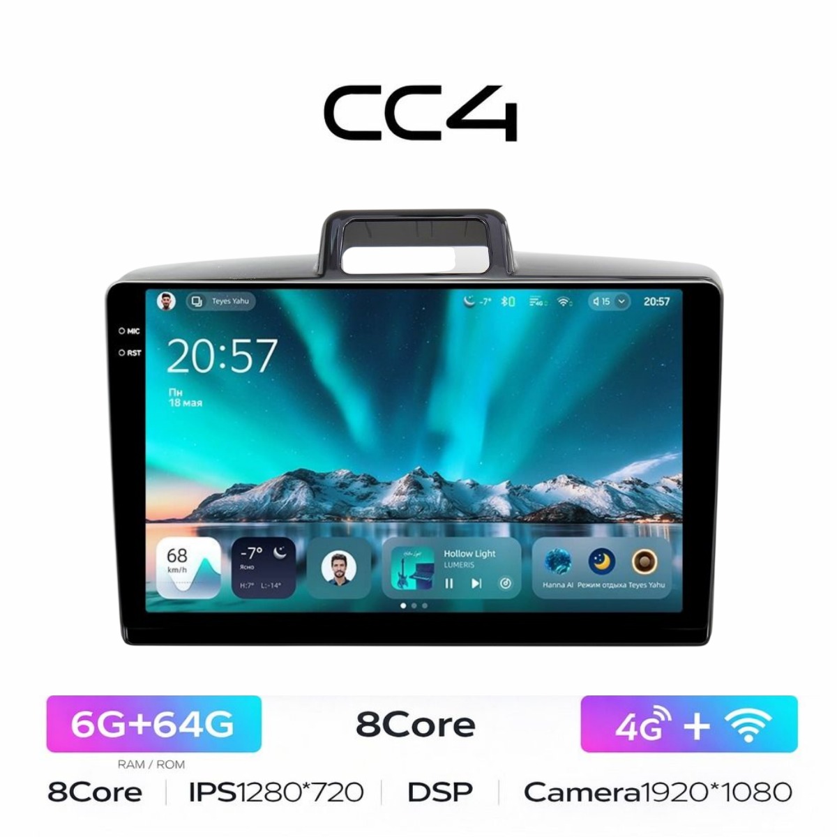 Есть функция разделения экрана на две части и слот под сим-карту 4G, что очень удобно в дороге! Смена тем экрана, а также поддержка Wi-FI, Bluetooth, Carplay, подключение задней камеры.