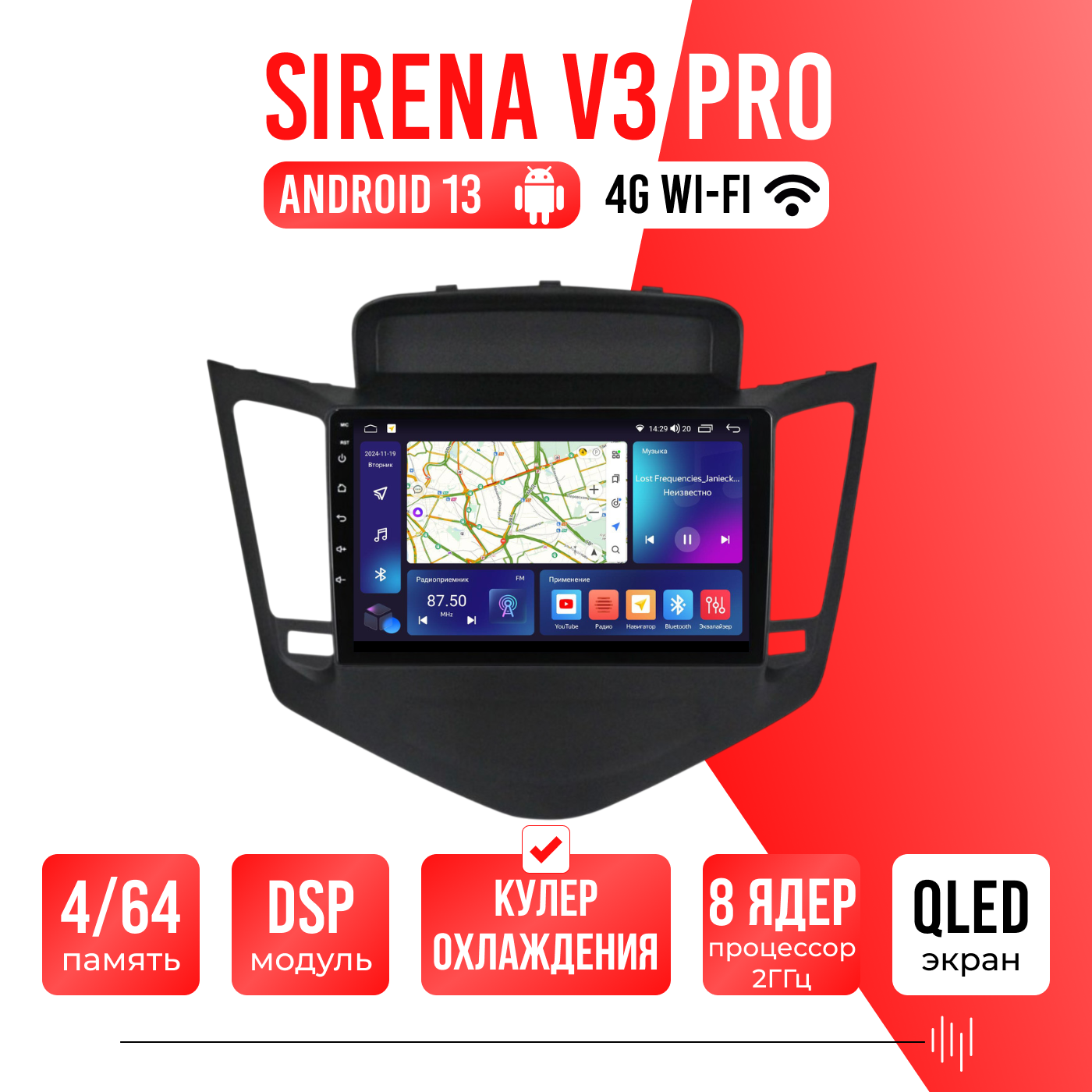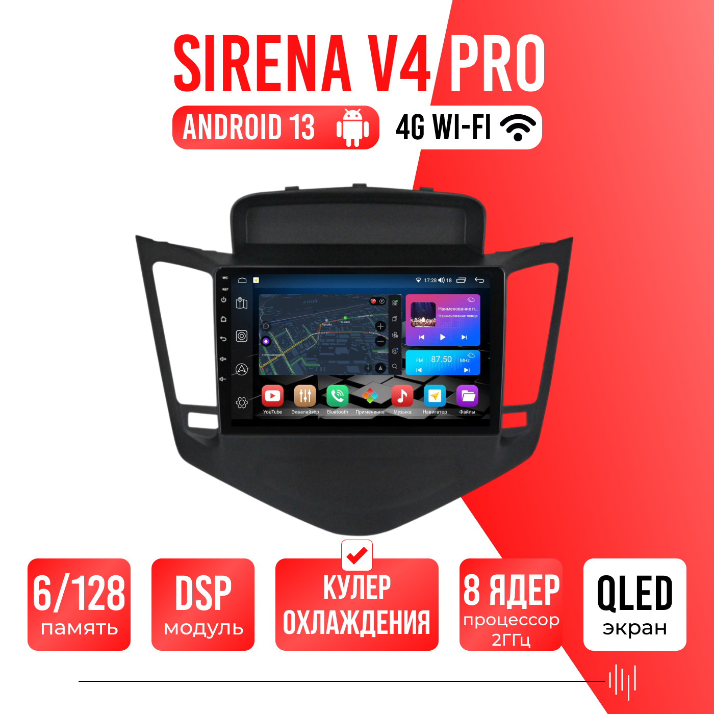 Sirena V4 PRO ОС Android Память 6/128, Wi-Fi, 4G, QLED экран. Звуковой процессор DSP. Процессор 8 ядер.