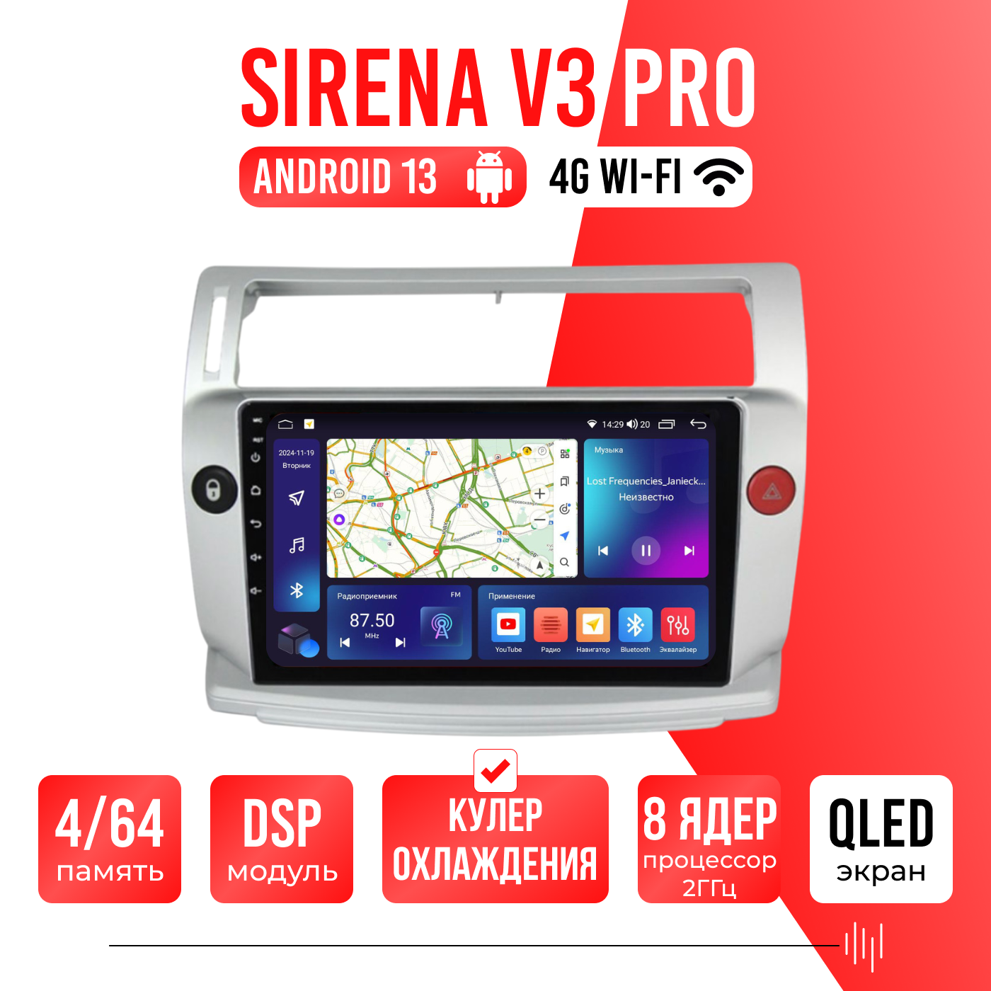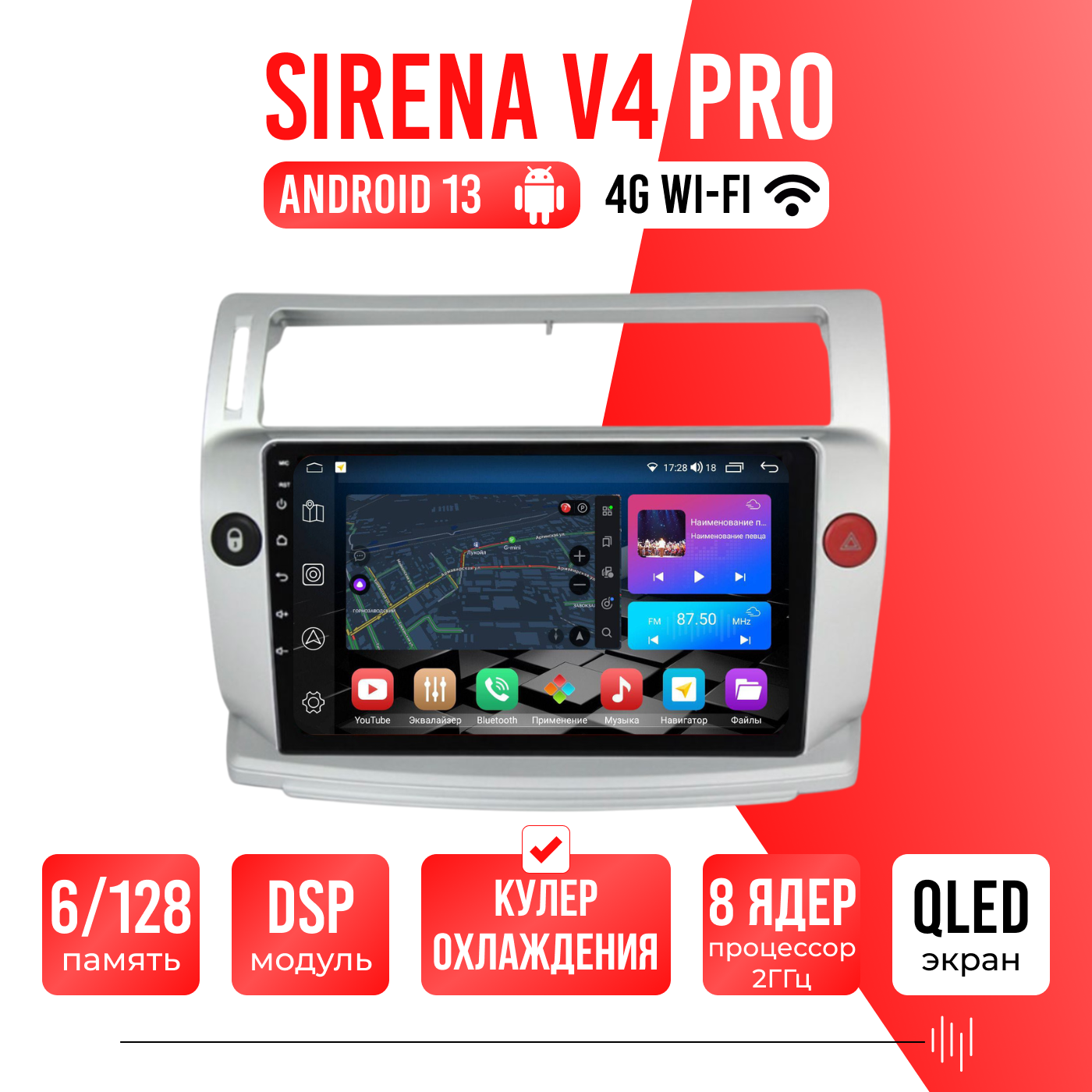 Sirena V4 PRO ОС Android Память 6/128, Wi-Fi, 4G, QLED экран. Звуковой процессор DSP. Процессор 8 ядер.