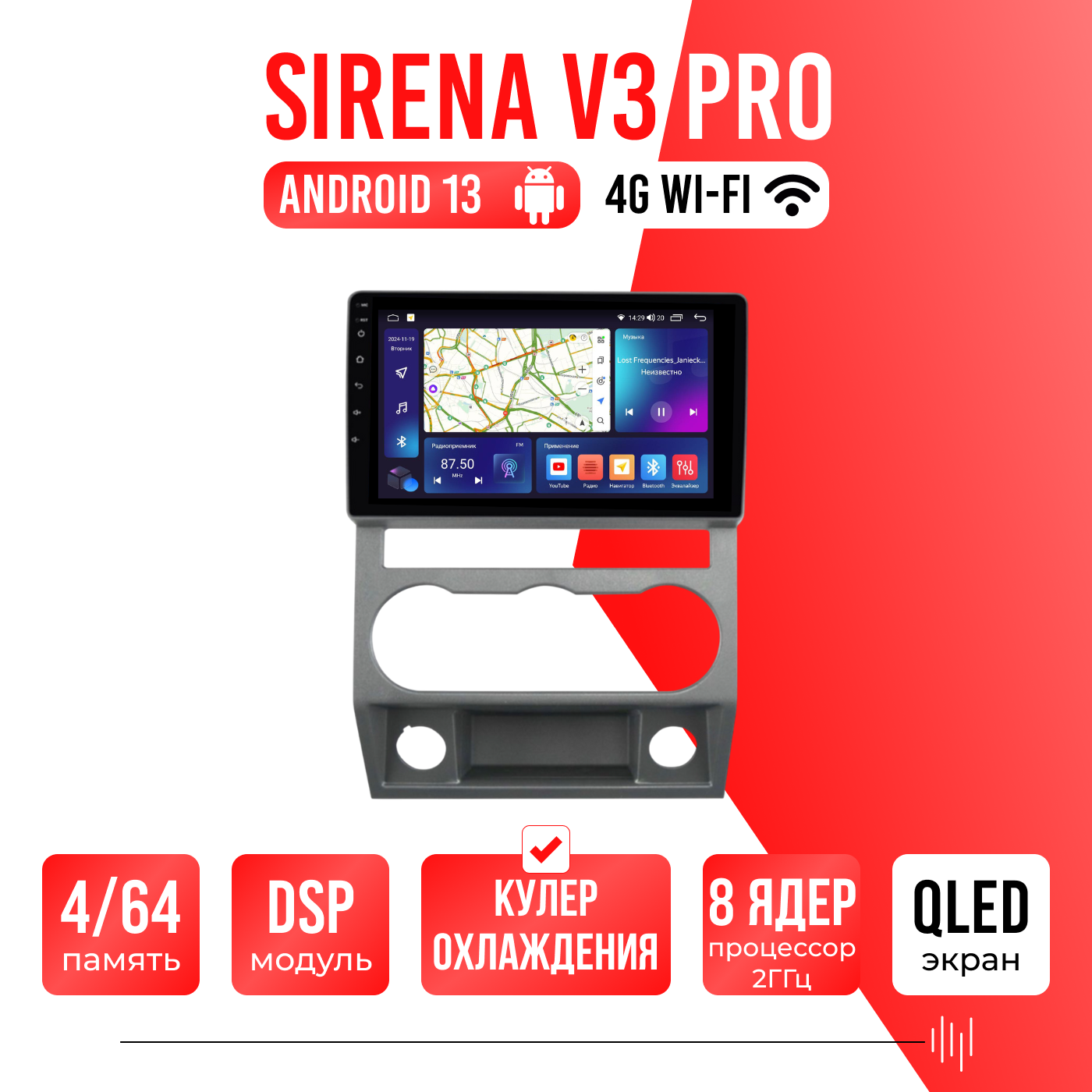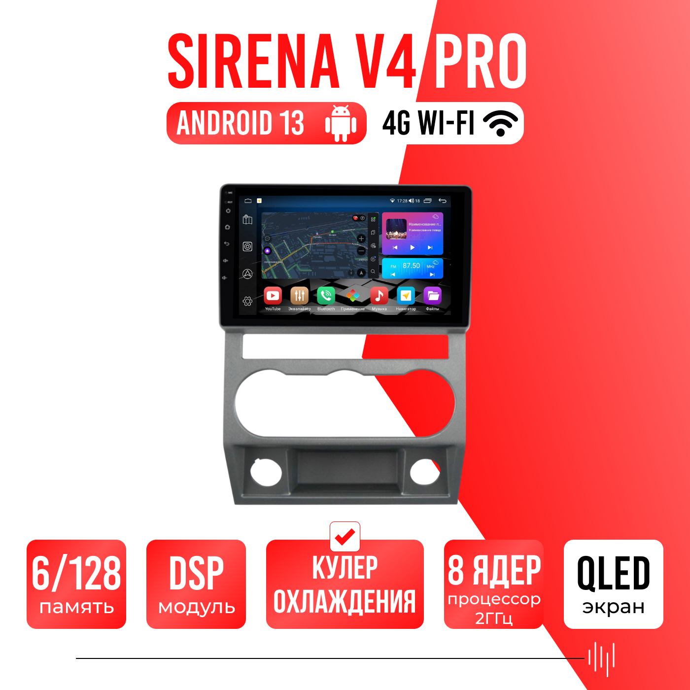 Sirena V4 PRO ОС Android Память 6/128, Wi-Fi, 4G, QLED экран. Звуковой процессор DSP. Процессор 8 ядер.