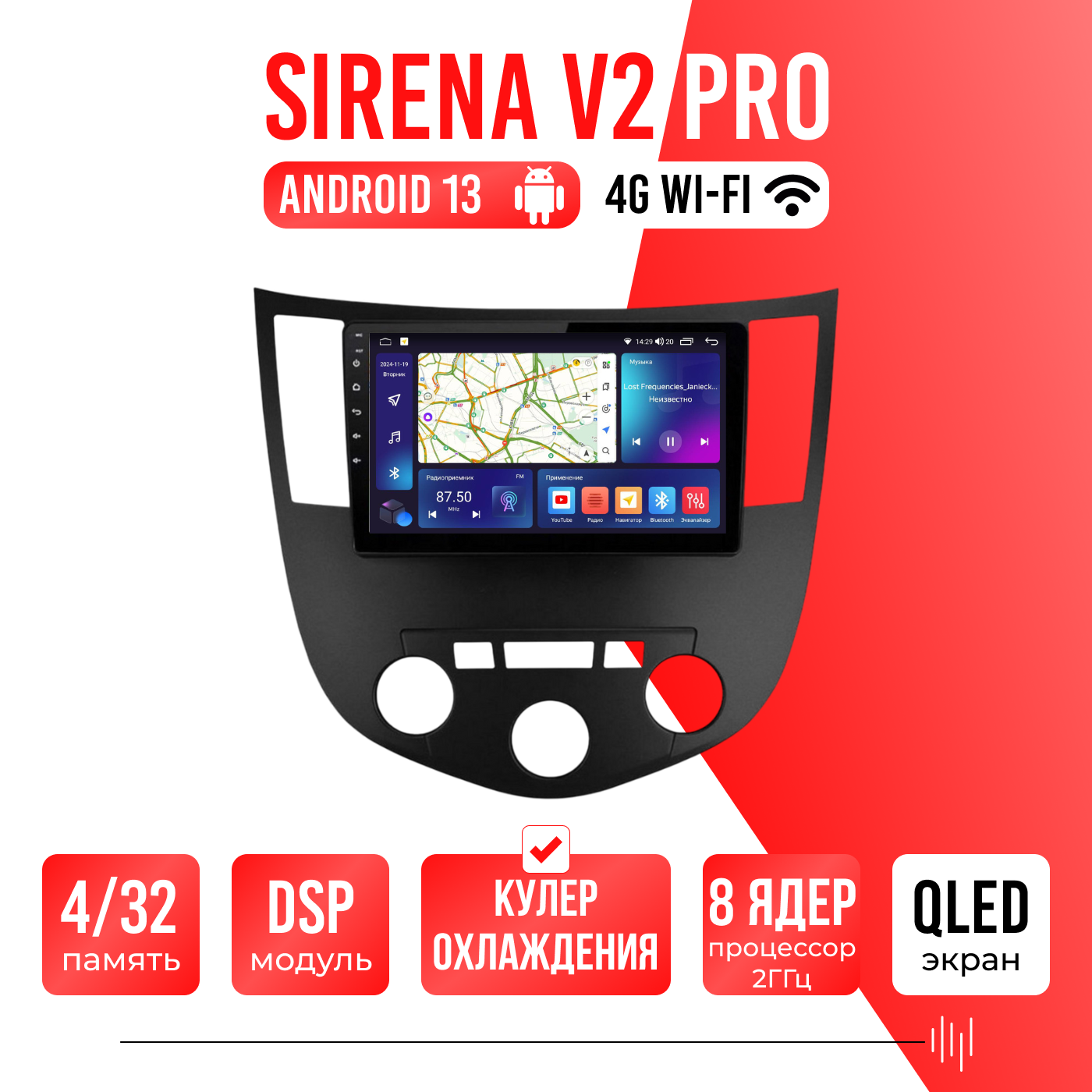 Sirena V4 PRO ОС Android Память 6/128, Wi-Fi, 4G, QLED экран. Звуковой процессор DSP. Процессор 8 ядер.