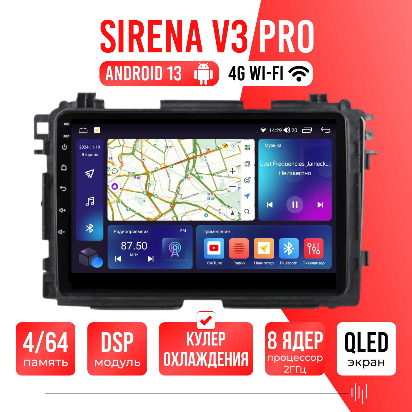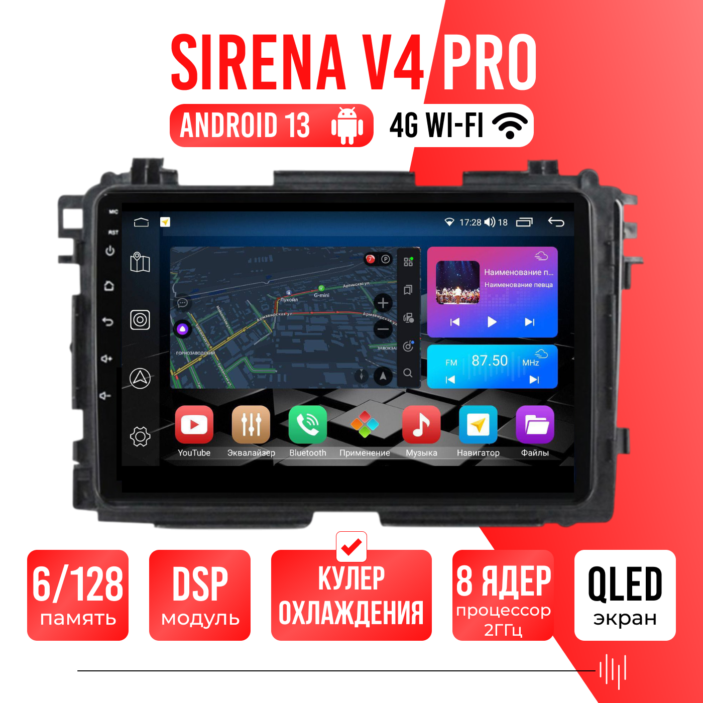 Sirena V4 PRO ОС Android Память 6/128, Wi-Fi, 4G, QLED экран. Звуковой процессор DSP. Процессор 8 ядер.
