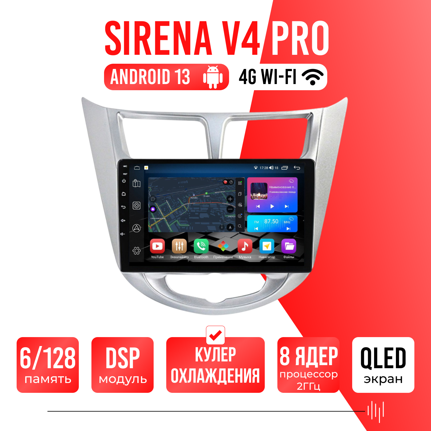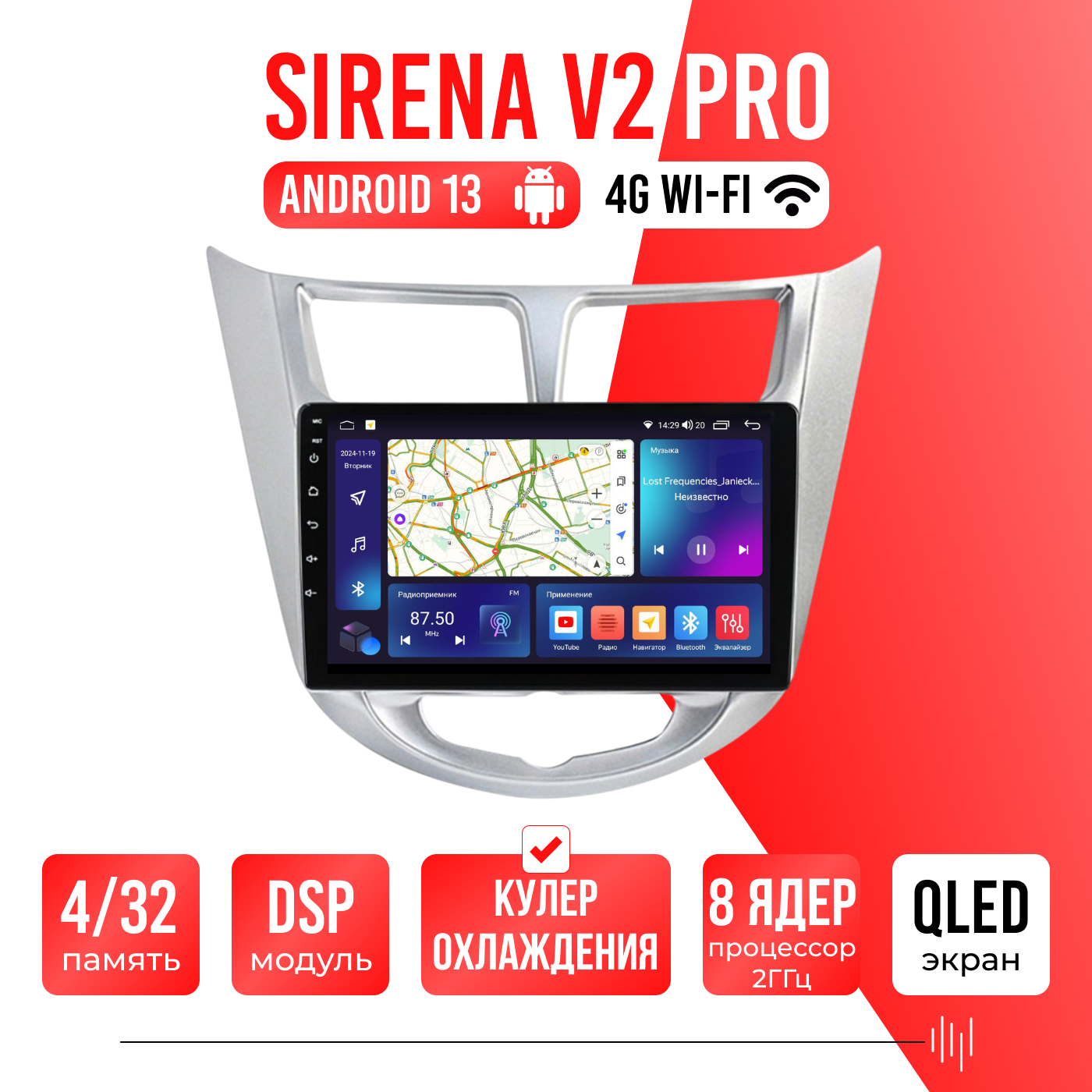 Sirena V4 PRO ОС Android Память 6/128, Wi-Fi, 4G, QLED экран. Звуковой процессор DSP. Процессор 8 ядер.