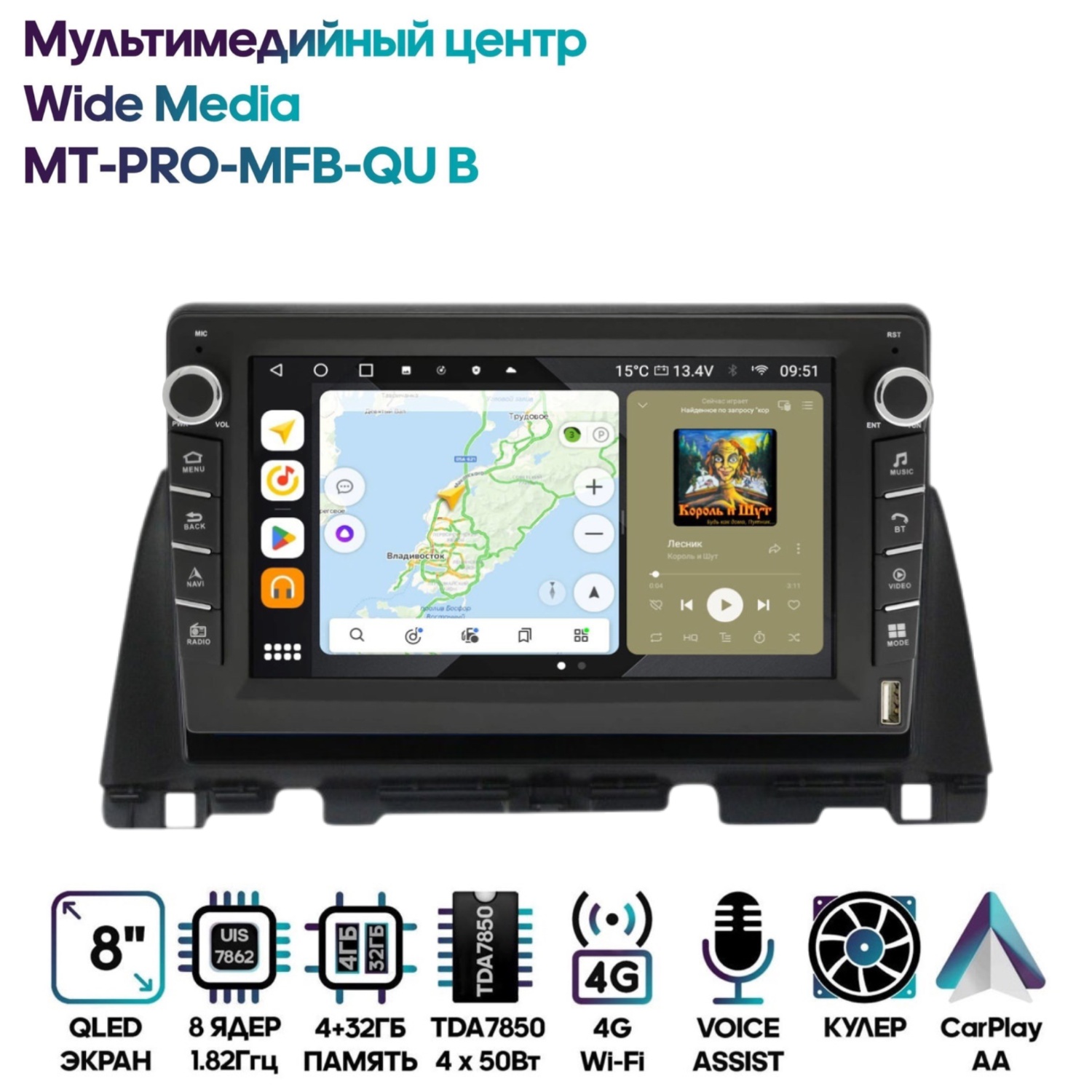 Магнитола Wide Media MT-PRO-MFB-QU B 4/32 с механической регулировкой громкости