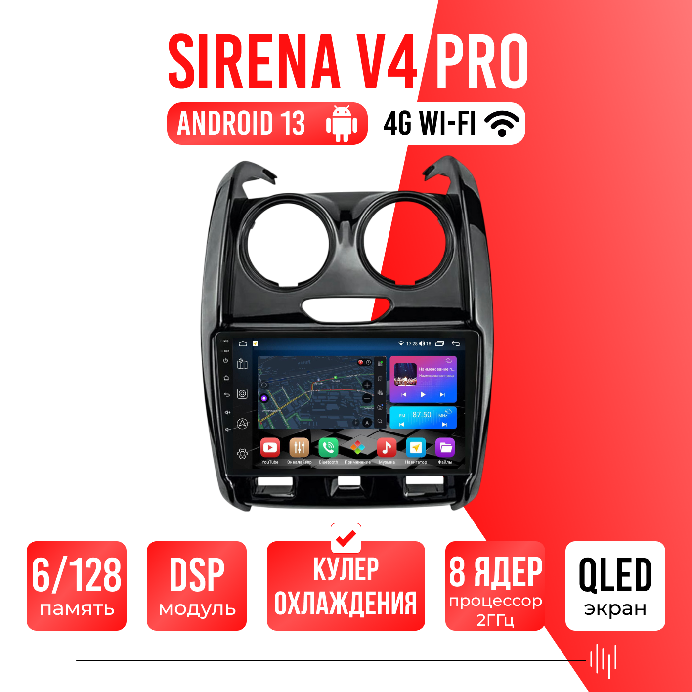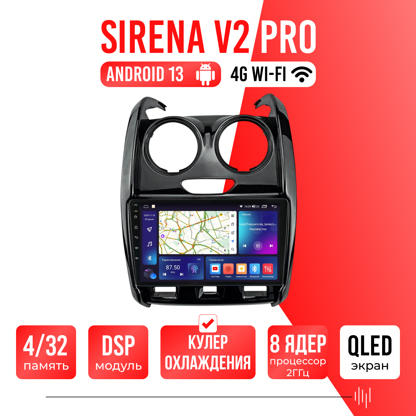 Sirena V4 PRO ОС Android Память 6/128, Wi-Fi, 4G, QLED экран. Звуковой процессор DSP. Процессор 8 ядер.