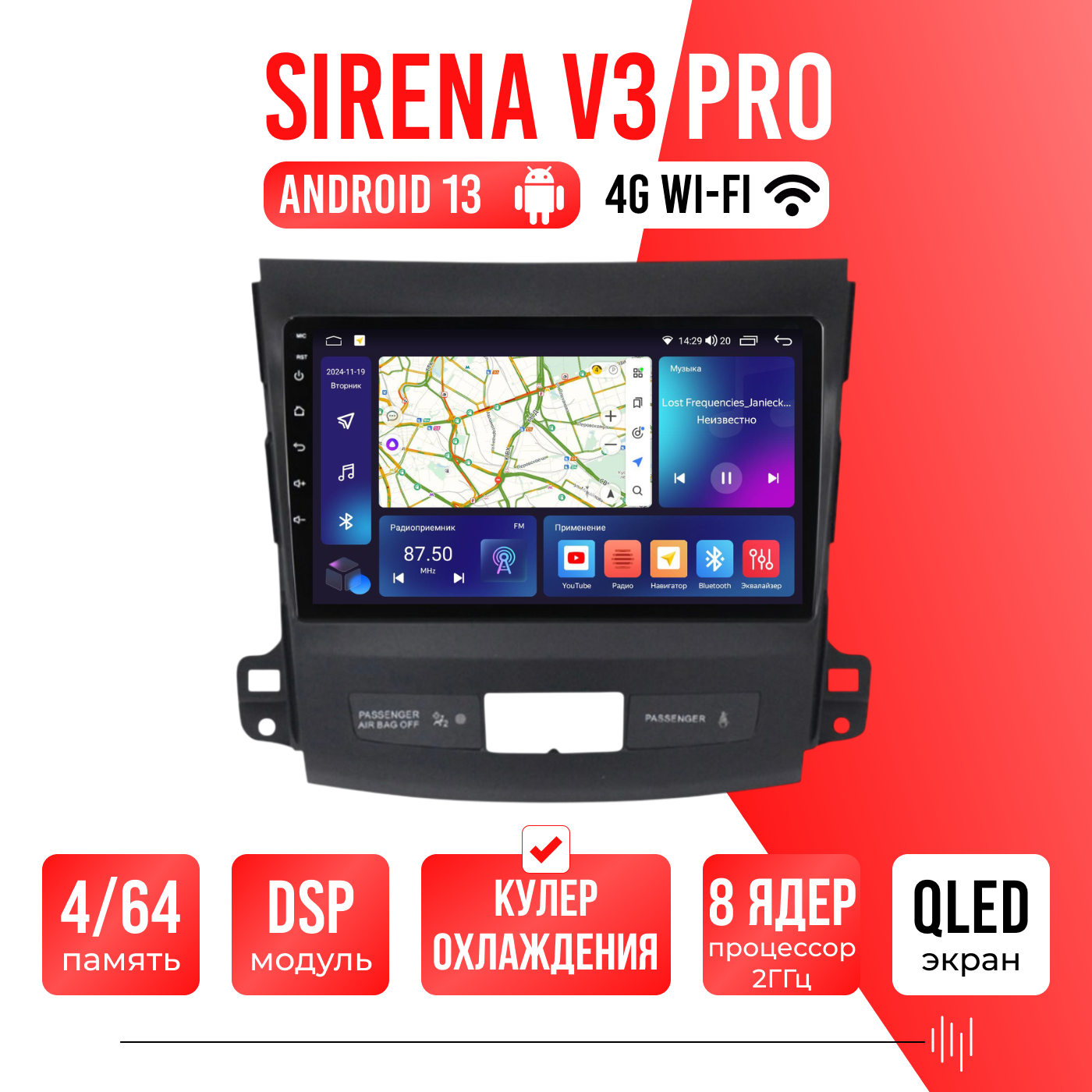 Sirena V4 PRO ОС Android Память 6/128, Wi-Fi, 4G, QLED экран. Звуковой процессор DSP. Процессор 8 ядер.