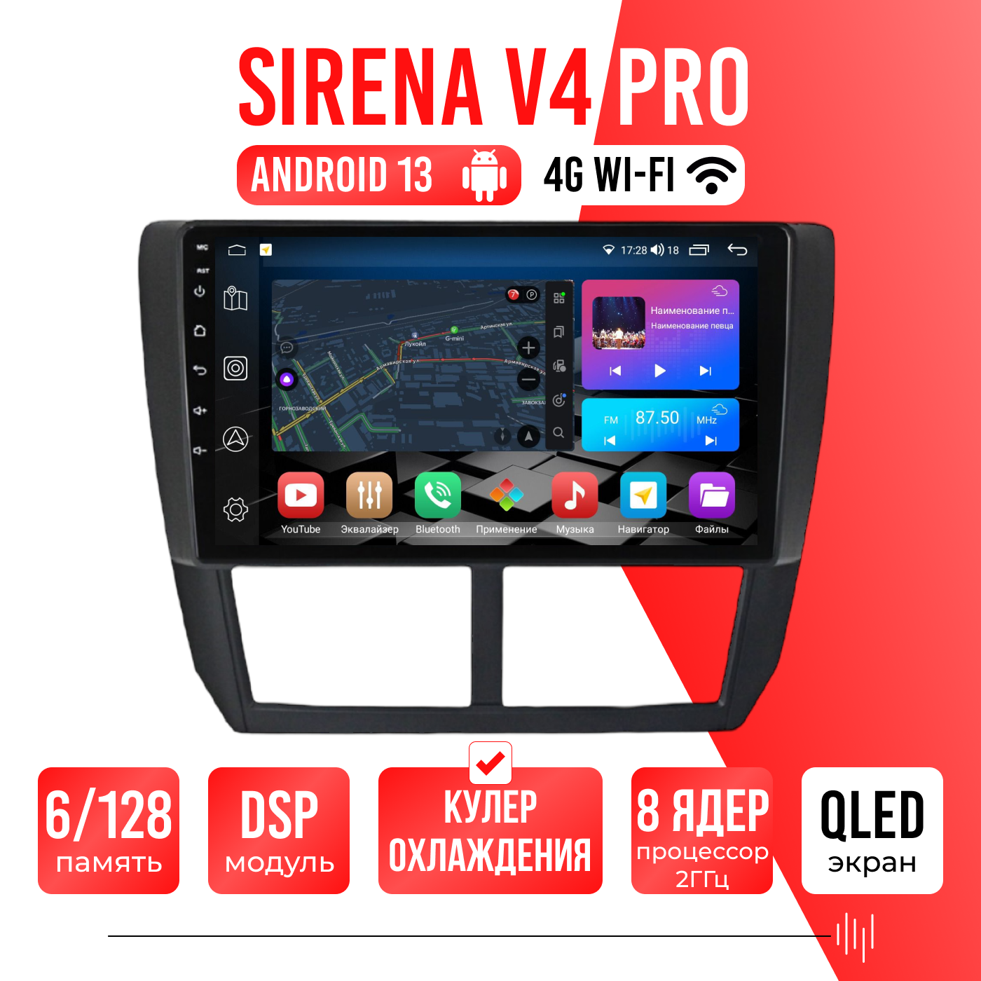 Sirena V4 PRO ОС Android Память 6/128, Wi-Fi, 4G, QLED экран. Звуковой процессор DSP. Процессор 8 ядер.