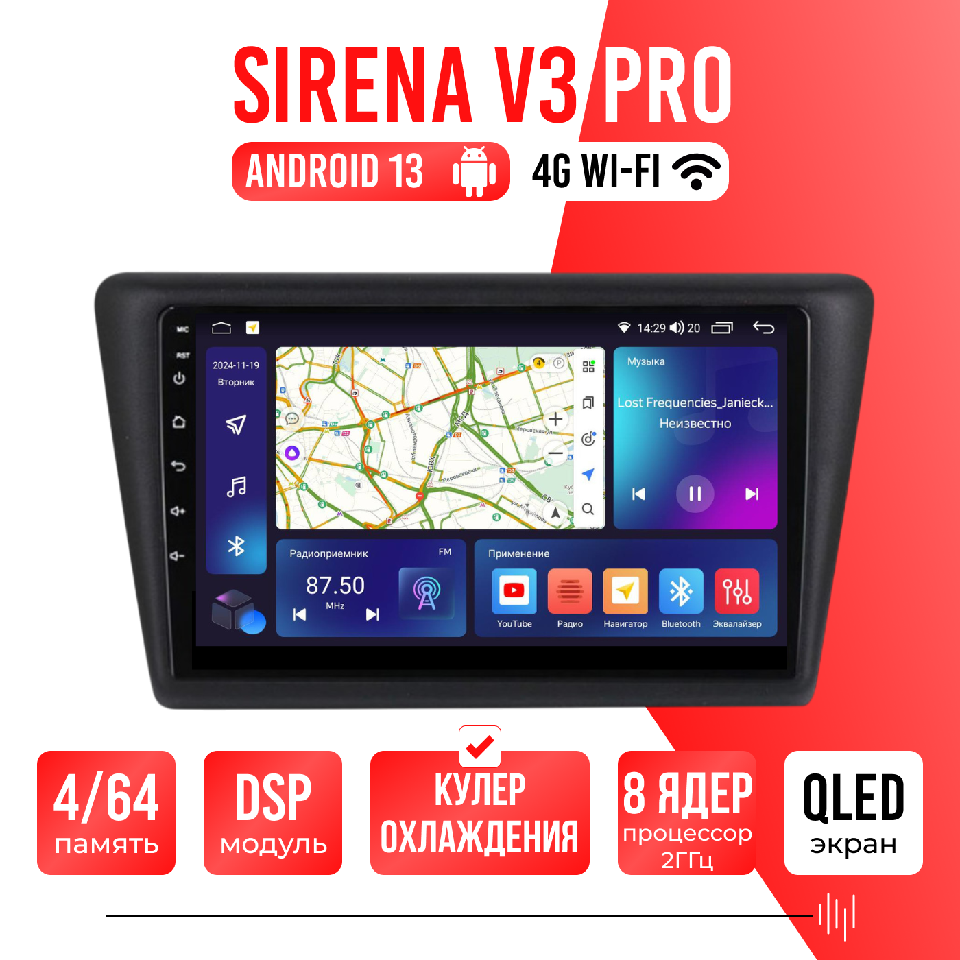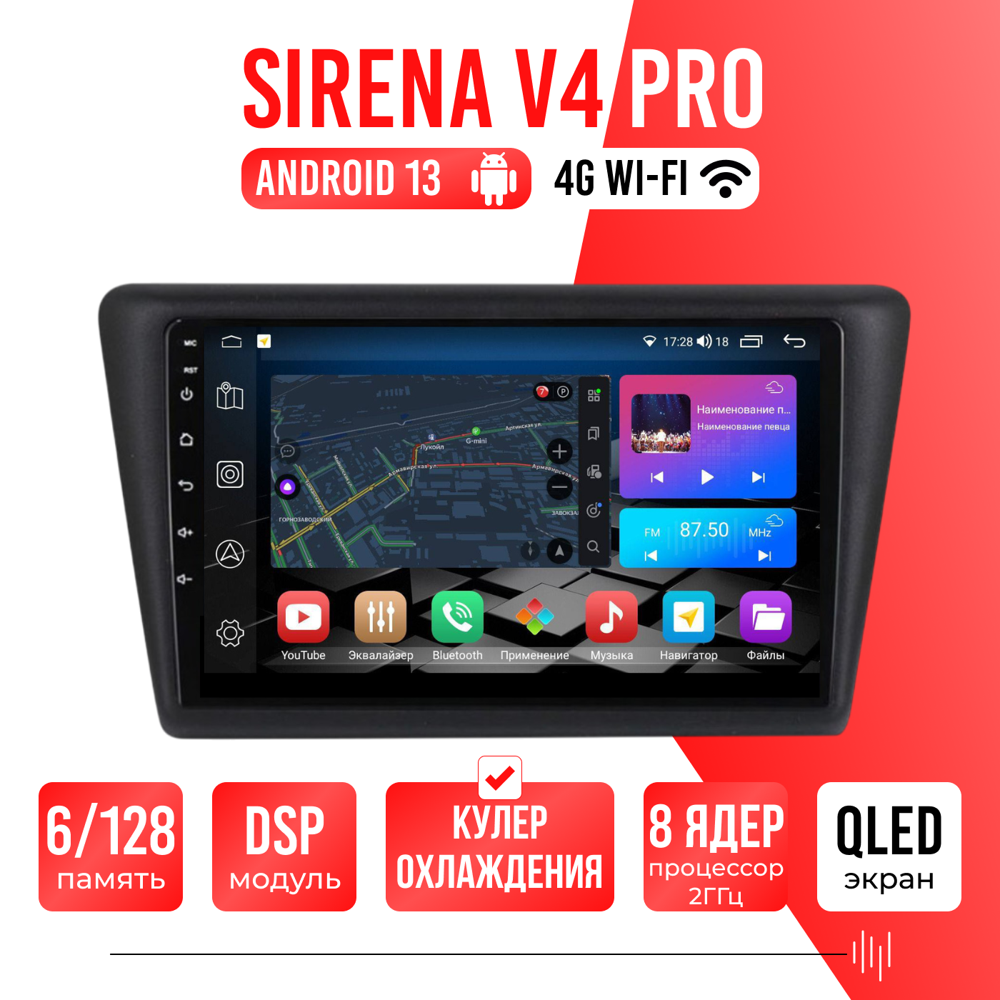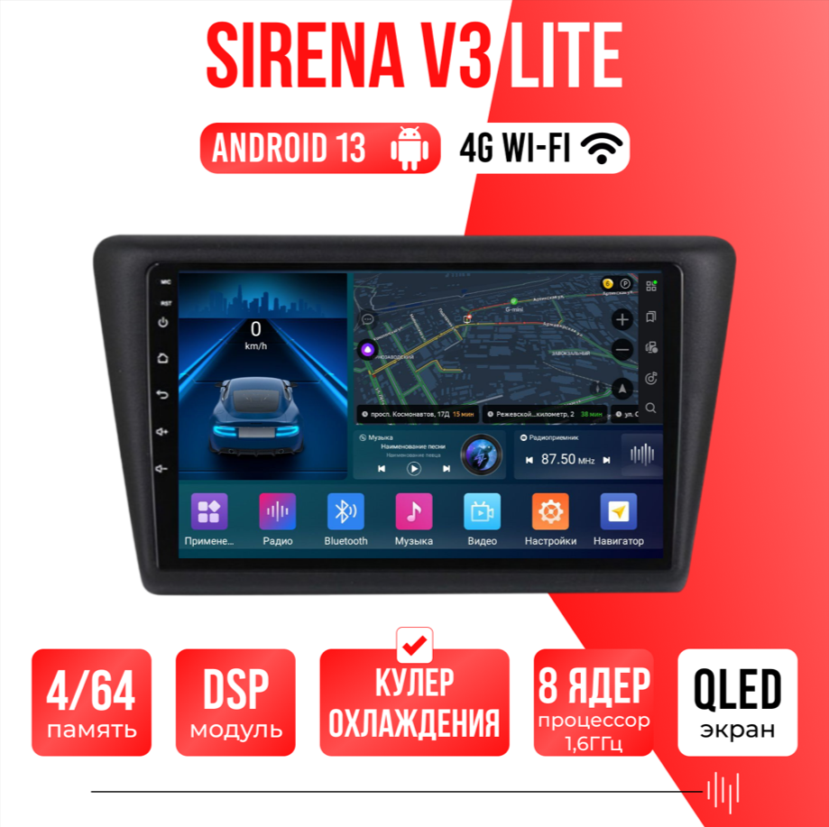 Sirena V4 PRO ОС Android Память 6/128, Wi-Fi, 4G, QLED экран. Звуковой процессор DSP. Процессор 8 ядер.