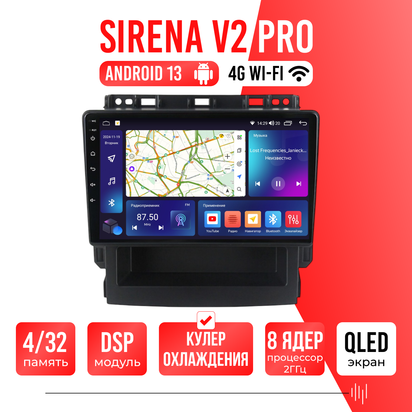 Sirena V4 PRO ОС Android Память 6/128, Wi-Fi, 4G, QLED экран. Звуковой процессор DSP. Процессор 8 ядер.