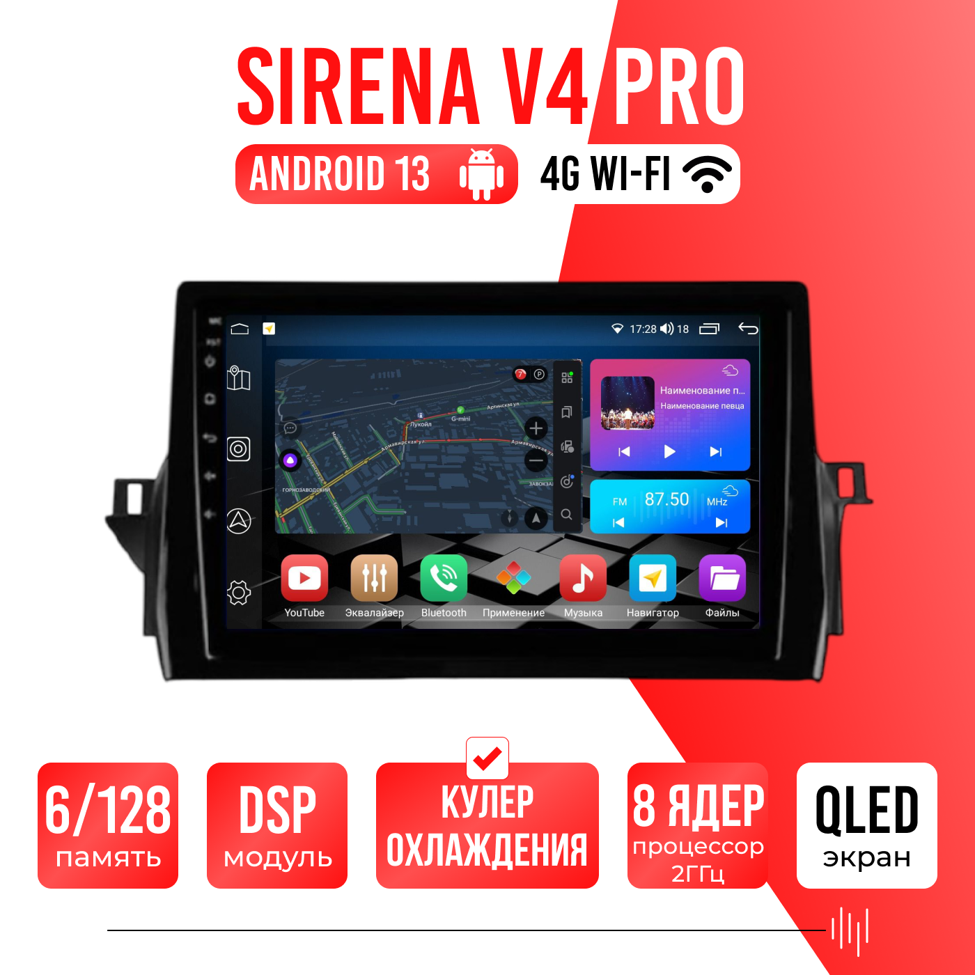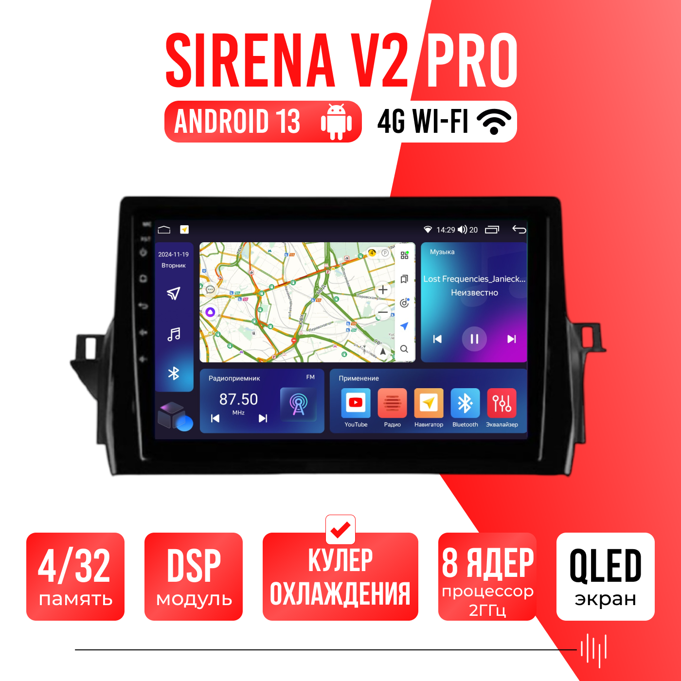 Sirena V4 PRO ОС Android Память 6/128, Wi-Fi, 4G, QLED экран. Звуковой процессор DSP. Процессор 8 ядер.
