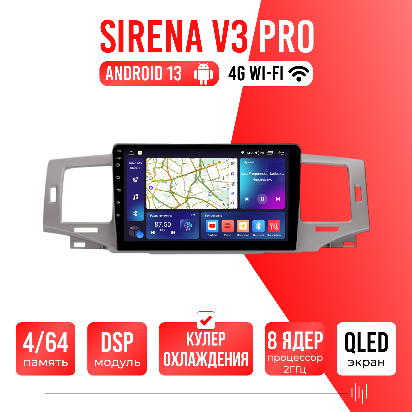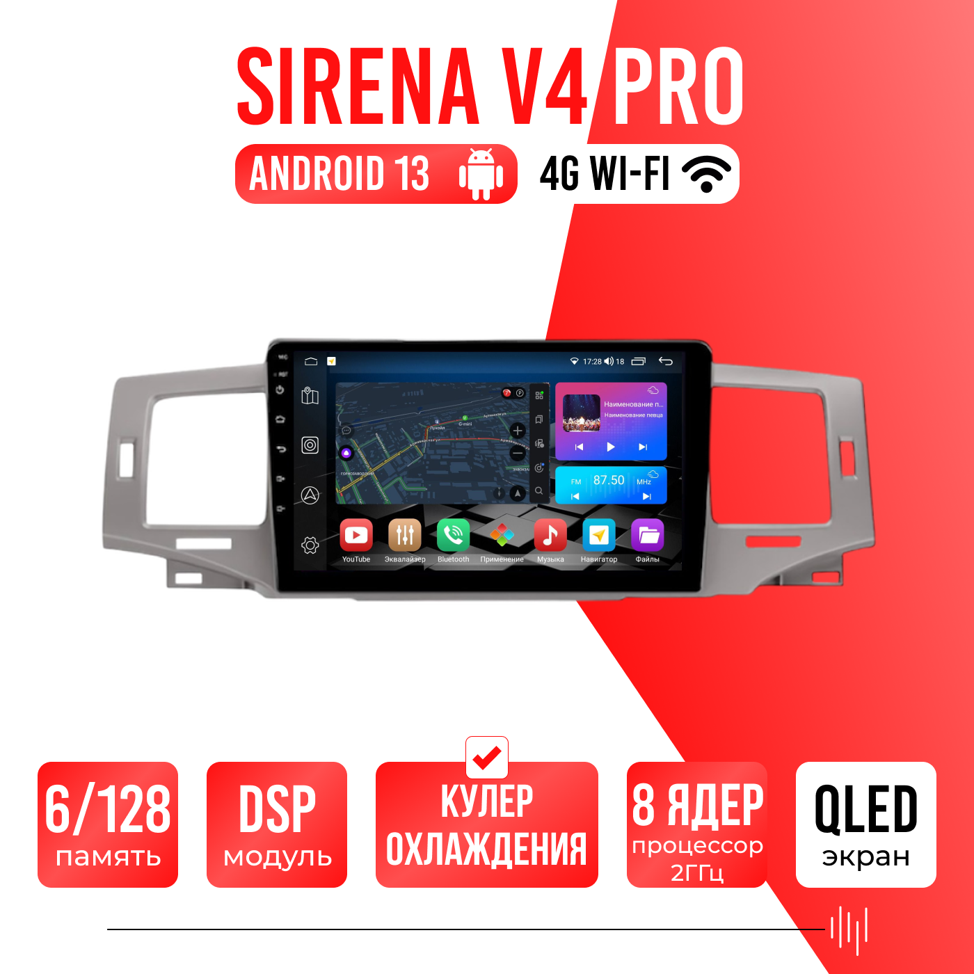 Sirena V4 PRO ОС Android Память 6/128, Wi-Fi, 4G, QLED экран. Звуковой процессор DSP. Процессор 8 ядер.
