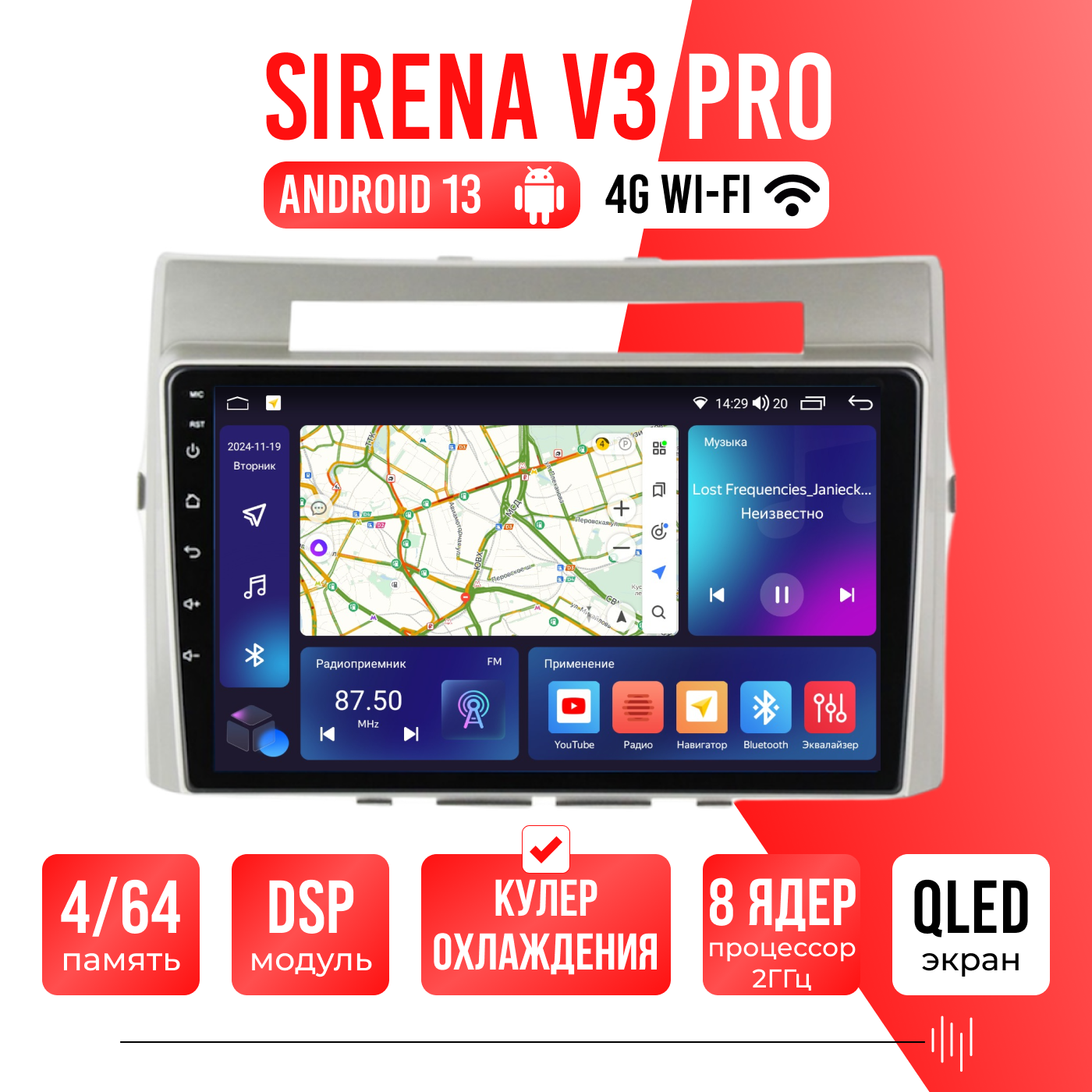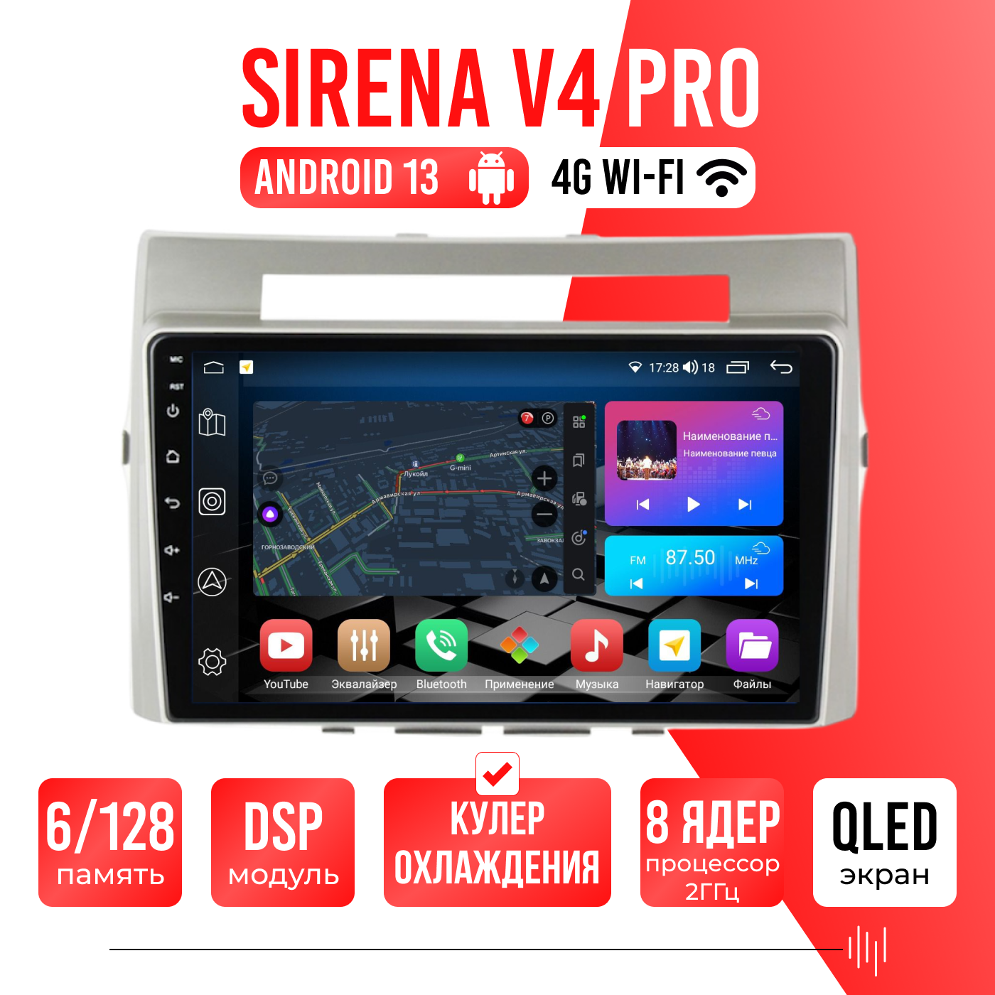 Sirena V4 PRO ОС Android Память 6/128, Wi-Fi, 4G, QLED экран. Звуковой процессор DSP. Процессор 8 ядер.