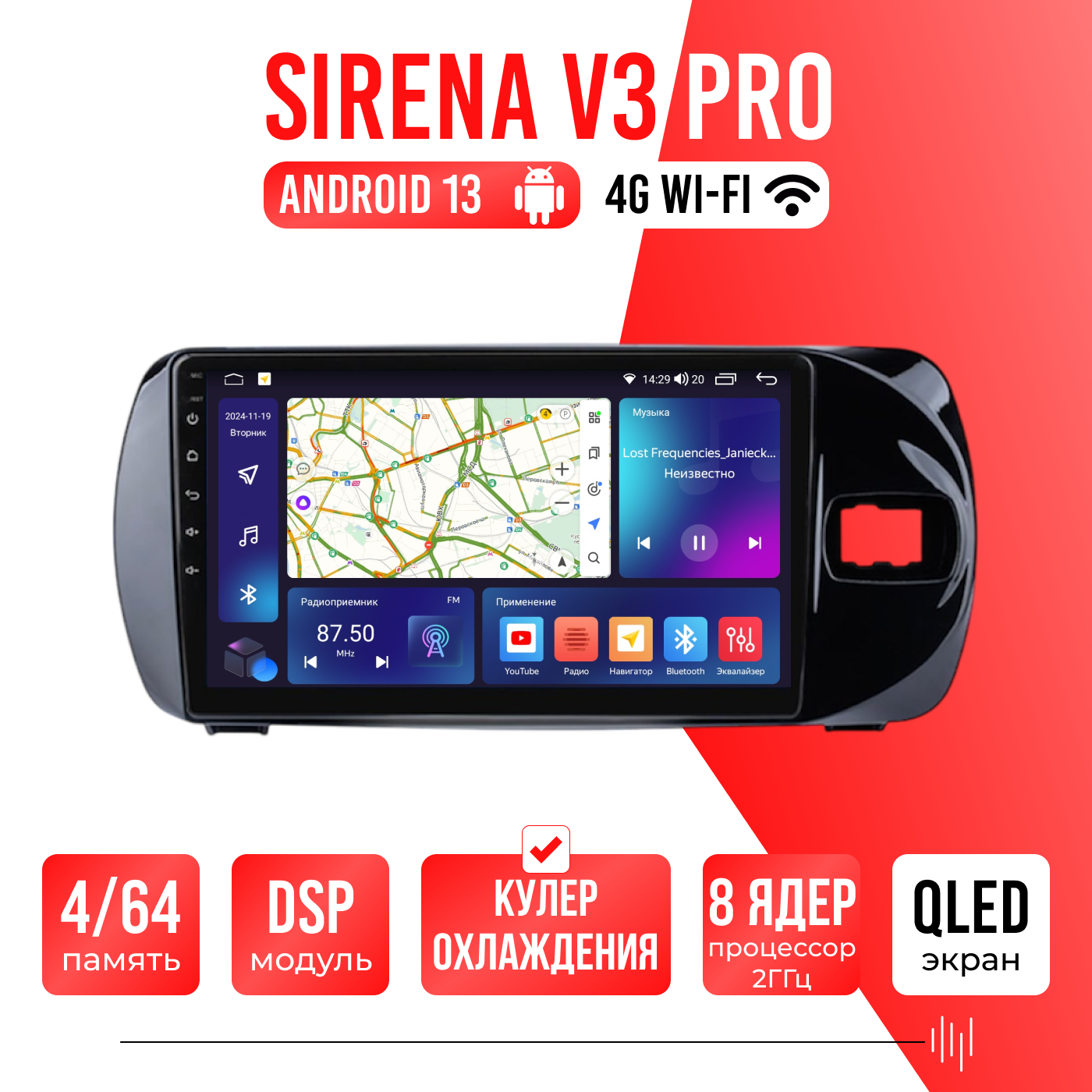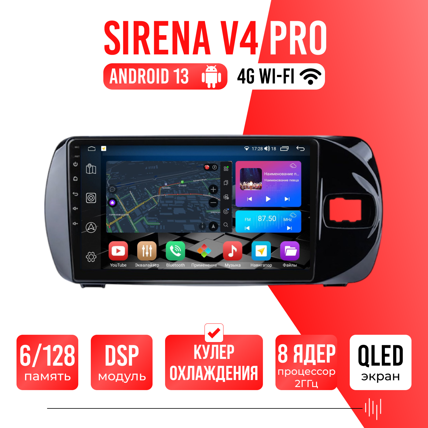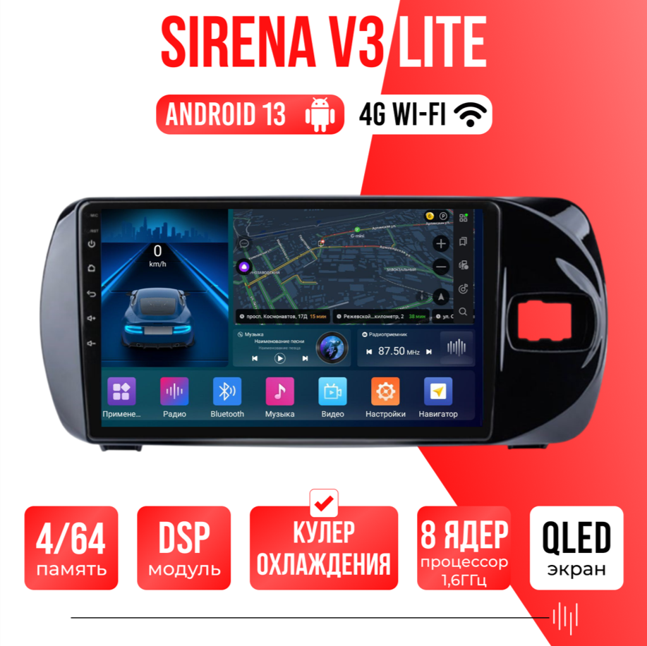 Sirena V4 PRO ОС Android Память 6/128, Wi-Fi, 4G, QLED экран. Звуковой процессор DSP. Процессор 8 ядер.