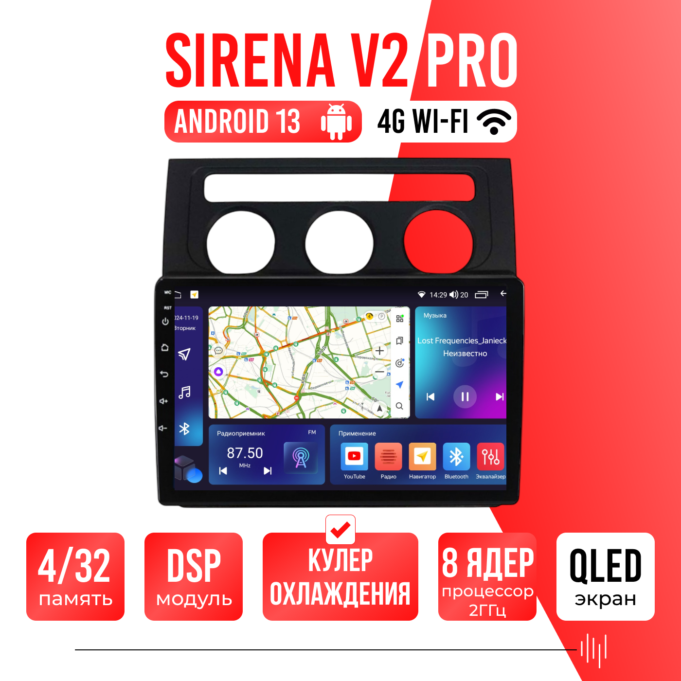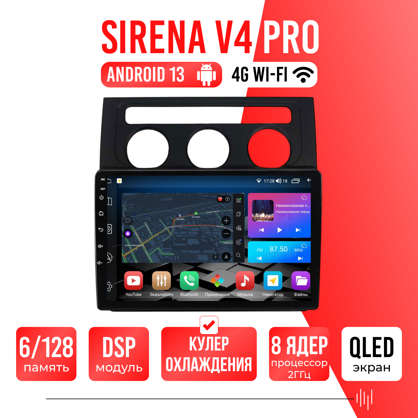 Sirena V4 PRO ОС Android Память 6/128, Wi-Fi, 4G, QLED экран. Звуковой процессор DSP. Процессор 8 ядер.